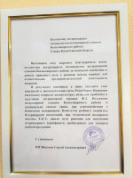 2025 жылғы 21 қазанда жеке кәсіпкер С. А. Микотин атынан кәсіпорын мамандарына «ветеринариялық анықтама беру» мемлекеттік қызметін көрсетуге көмектескені үшін алғыс хат табыс етілді.